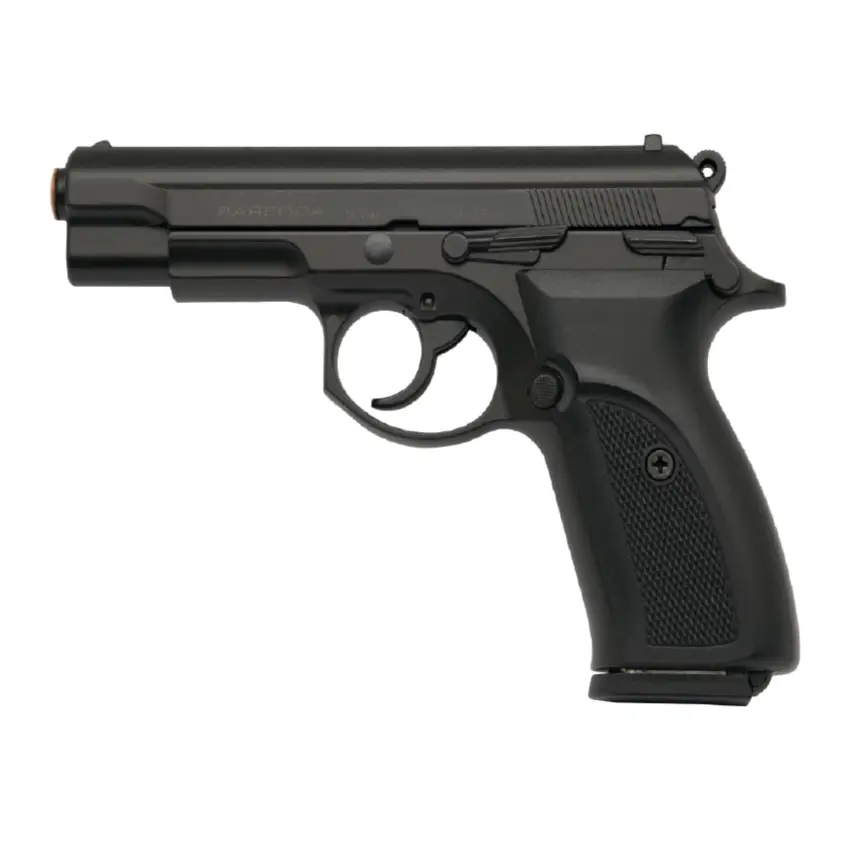 Caliber:9 mm P.A.K Capacity:14+1 Lenght: 197,50 mm Height: 136 mm Width:31 mm Barrel Length:117 mm Weight Not Loaded:996 gr Loaded Clip Weight:950 gr